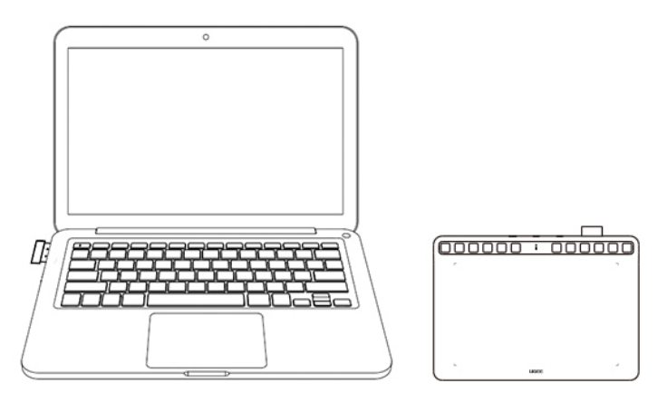 Find the USB-C cable from the box, and use it to connect the tablet to the computer. (USB-A end goes to the USB port on the computer and the USB-C end goes to the USB-C port on the tablet)